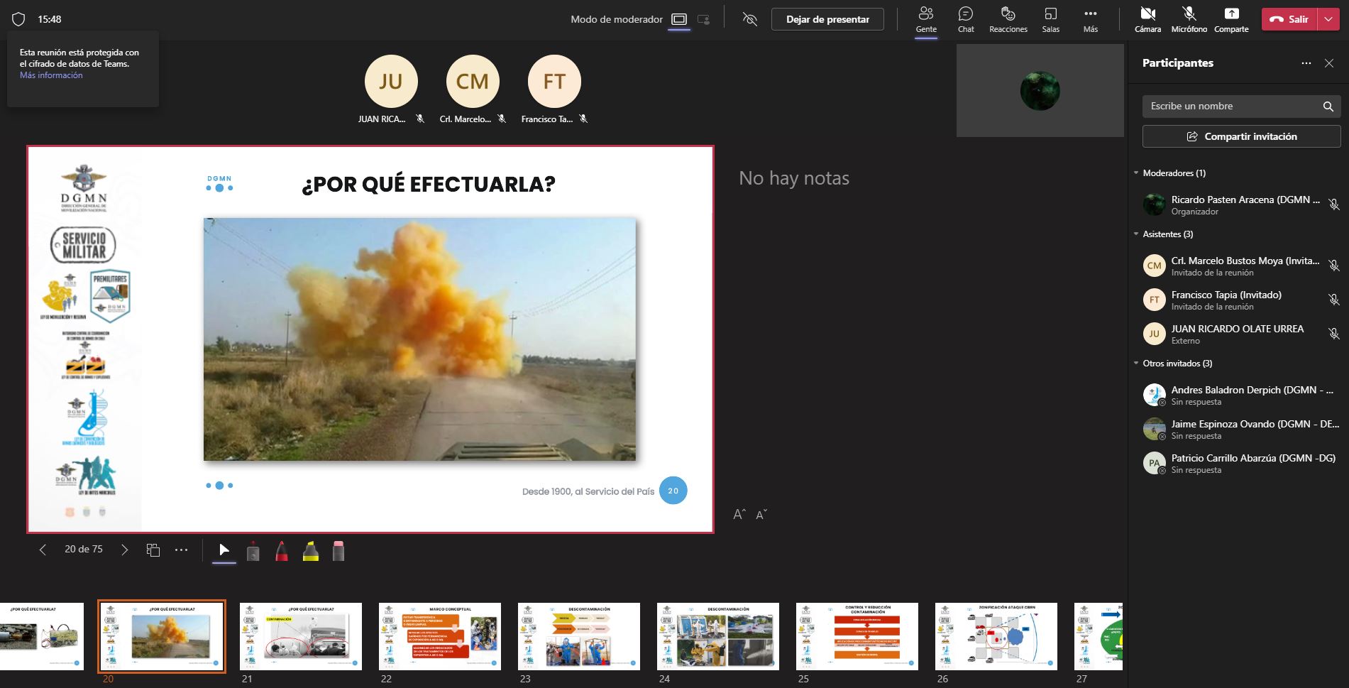 La Dirección General de Movilización Nacional (DGMN), Autoridad Nacional en la implementación de la Ley de Convenciones Internacionales de Prohibición de Armas Químicas y Armas Biológicas capacitó, entre el 19 al 21 de abril, a Carabineros de Chile en la temática CBRN (Chemical, Biological, Radiological and Nuclear Weapons ).